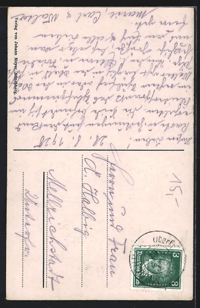Personenbezogene Daten auf der Rückseite der Karte wurden durch blauen Textmarker unkenntlich gemacht. Die blauen Stellen sind auf die Vorderseite durchgeweicht und wirken sich negativ auf das Postkartenfoto aus