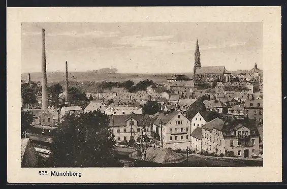 AK Münchberg / Obfr., Teilansicht mit Fabrik und Kirche aus der Vogelschau