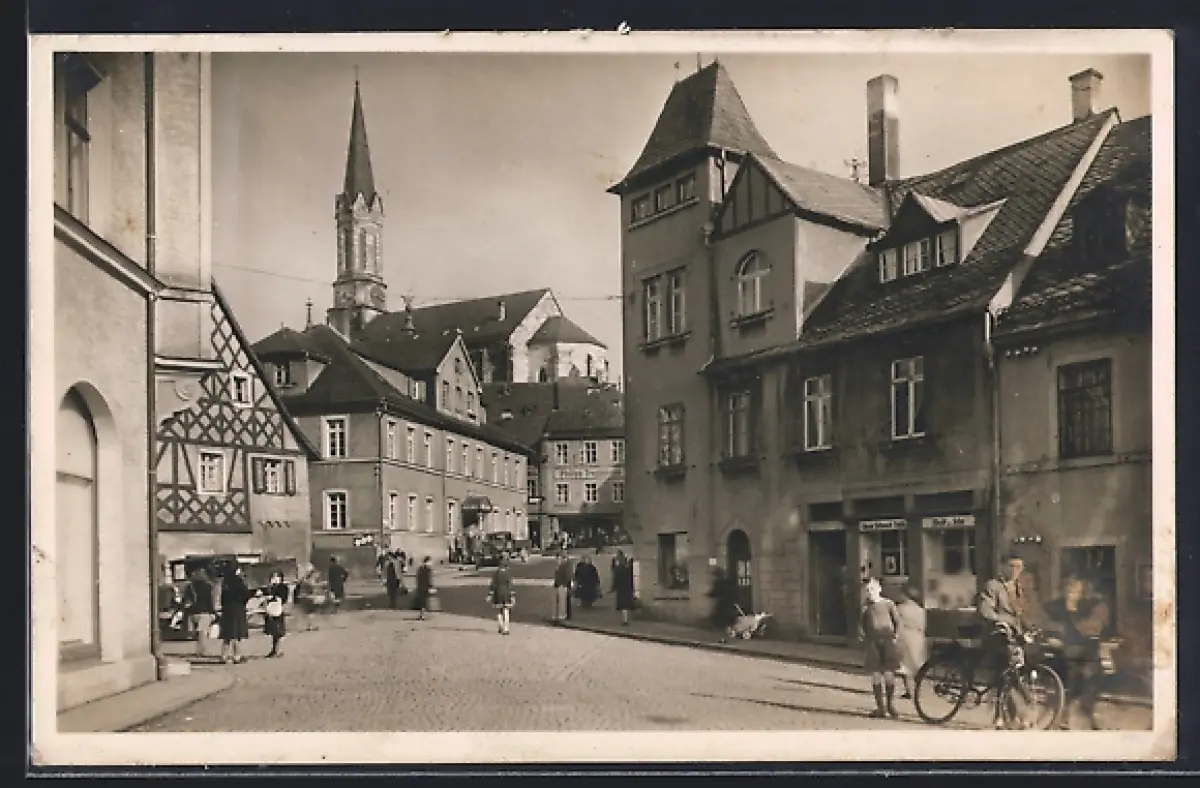 AK Münchberg /Ofr., Belebte Strassenpartie mit Kirche