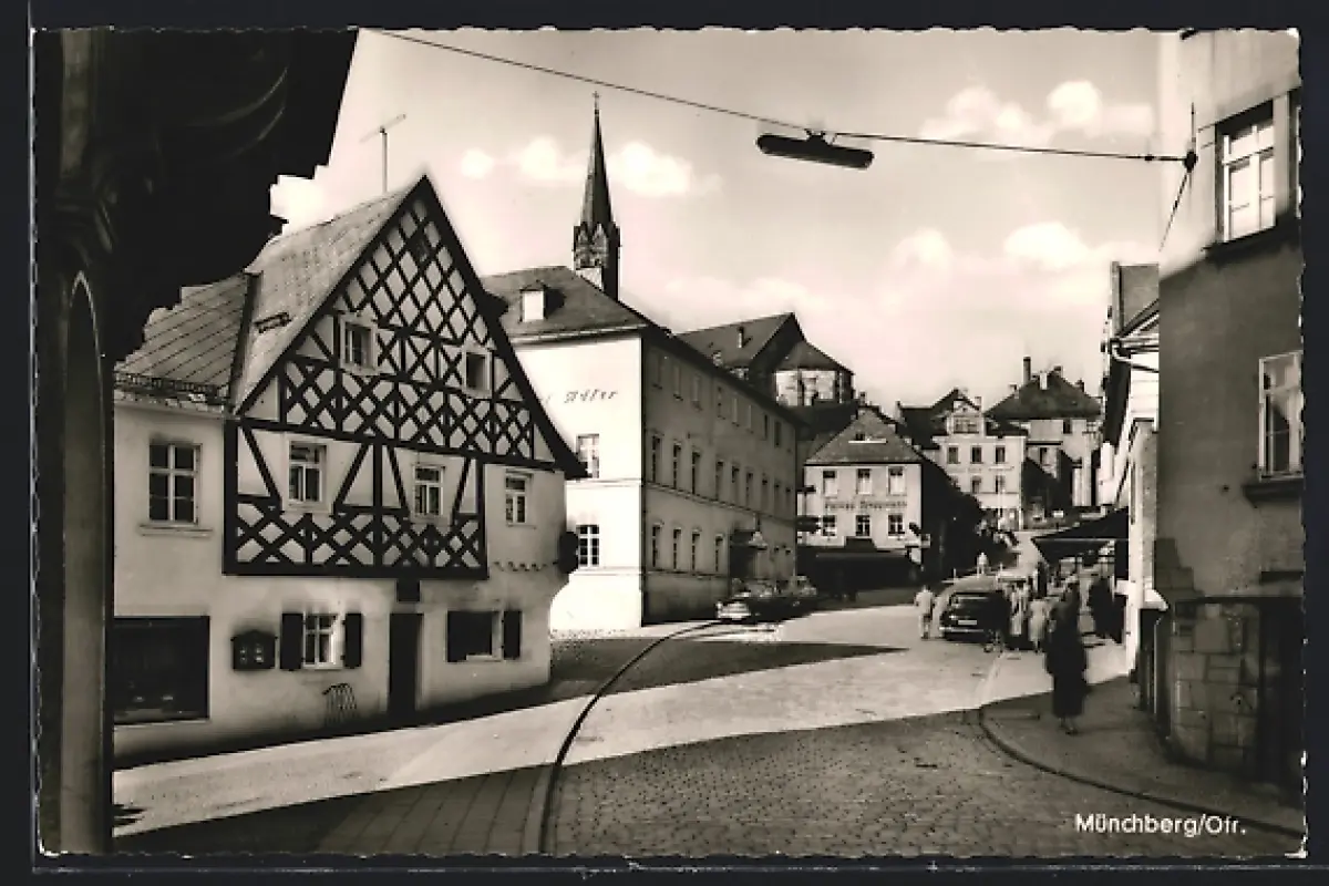 AK Münchberg /Ofr., Strassenpartie mit Geschäften