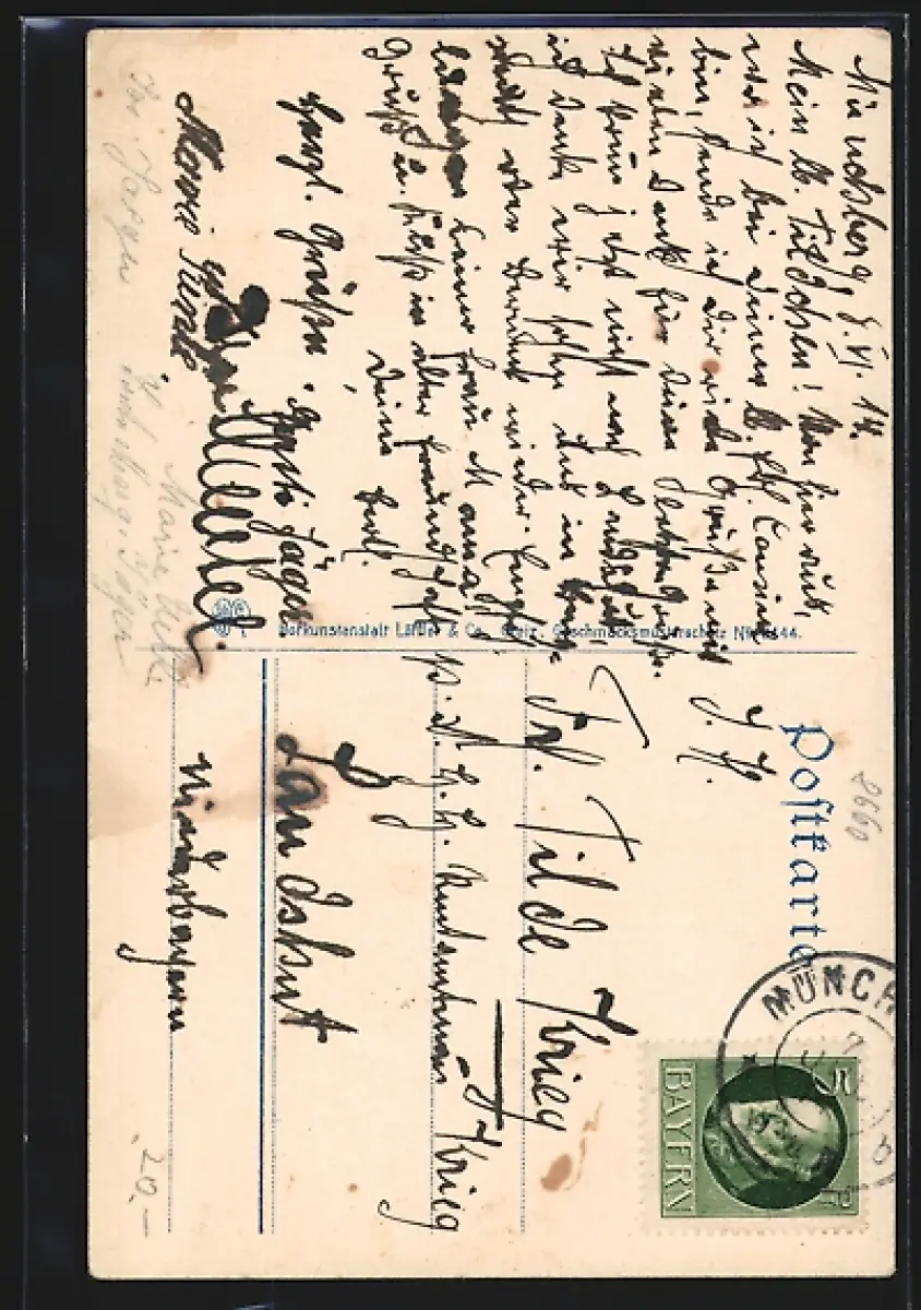 Personenbezogene Daten auf der Rückseite der Karte wurden durch blauen Textmarker unkenntlich gemacht. Die blauen Stellen sind auf die Vorderseite durchgeweicht und wirken sich negativ auf das Postkartenfoto aus