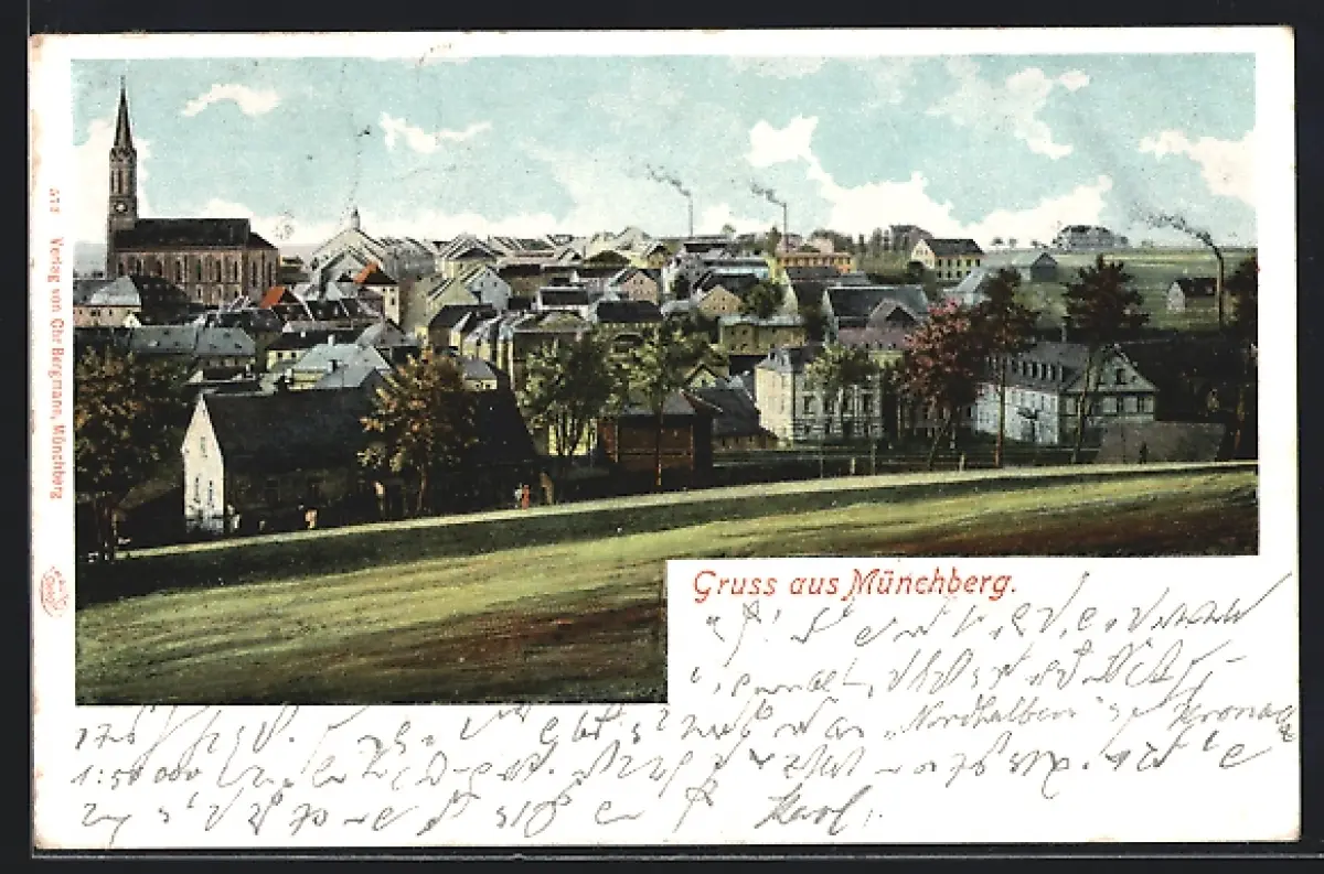 AK Münchberg, Ortsansicht mit Kirche und Wohnhäusern