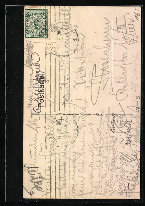 Personenbezogene Daten auf der Rückseite der Karte wurden durch blauen Textmarker unkenntlich gemacht. Die blauen Stellen sind auf die Vorderseite durchgeweicht und wirken sich negativ auf das Postkartenfoto aus
