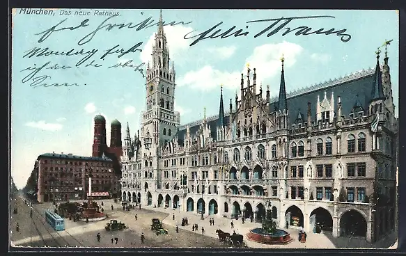 AK München-Au, Neues Rathaus mit Frauenkirche und Strassenbahn