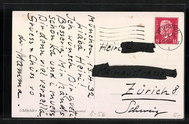 Personenbezogene Daten auf der Rückseite der Karte wurden durch blauen Textmarker unkenntlich gemacht. Die blauen Stellen sind auf die Vorderseite durchgeweicht und wirken sich negativ auf das Postkartenfoto aus