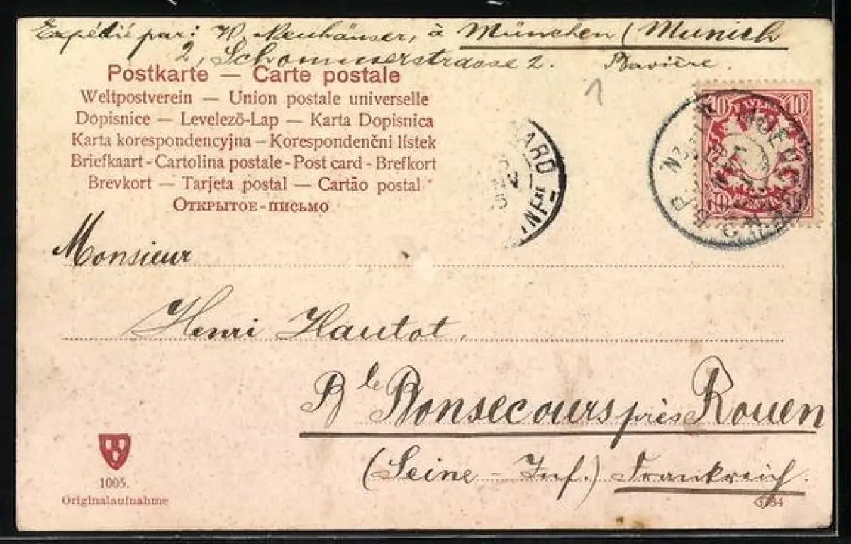 gelaufen 1905, rückseitig Klebe- und Papierreste, rückseitig Oberflächenschaden, guter Zustand