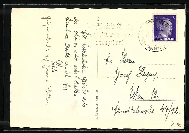 Personenbezogene Daten auf der Rückseite der Karte wurden durch blauen Textmarker unkenntlich gemacht. Die blauen Stellen sind auf die Vorderseite durchgeweicht und wirken sich negativ auf das Postkartenfoto aus