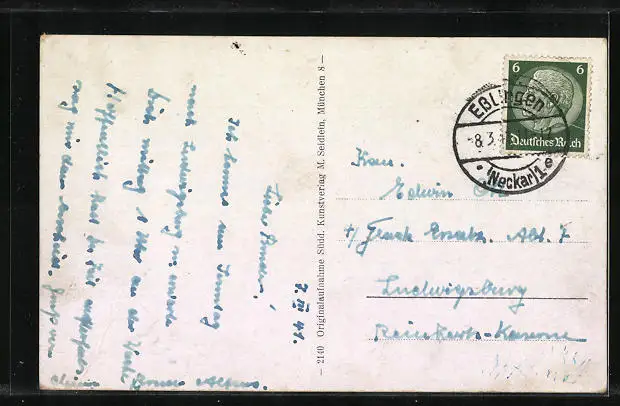 Personenbezogene Daten auf der Rückseite der Karte wurden durch blauen Textmarker unkenntlich gemacht. Die blauen Stellen sind auf die Vorderseite durchgeweicht und wirken sich negativ auf das Postkartenfoto aus