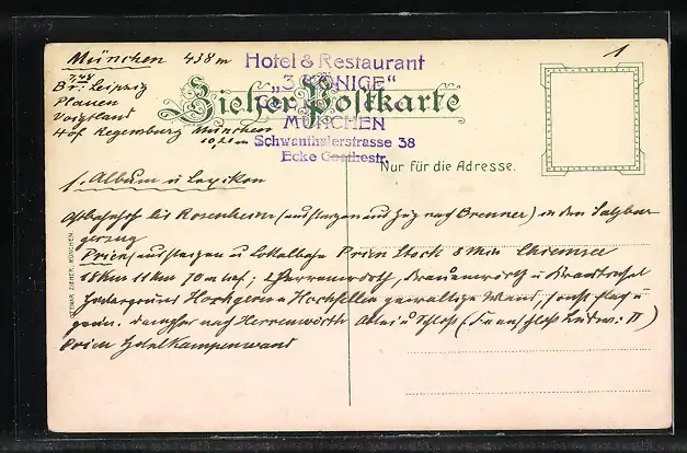 Personenbezogene Daten auf der Rückseite der Karte wurden durch blauen Textmarker unkenntlich gemacht. Die blauen Stellen sind auf die Vorderseite durchgeweicht und wirken sich negativ auf das Postkartenfoto aus