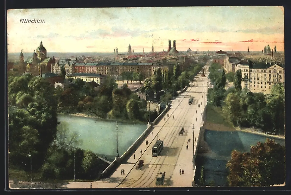 AK München, Brücke mit Strassenbahn