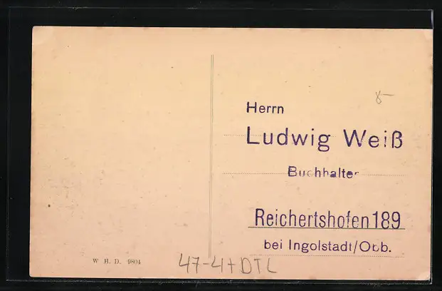 Personenbezogene Daten auf der Rückseite der Karte wurden durch blauen Textmarker unkenntlich gemacht. Die blauen Stellen sind auf die Vorderseite durchgeweicht und wirken sich negativ auf das Postkartenfoto aus