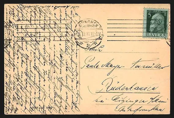 Personenbezogene Daten auf der Rückseite der Karte wurden durch blauen Textmarker unkenntlich gemacht. Die blauen Stellen sind auf die Vorderseite durchgeweicht und wirken sich negativ auf das Postkartenfoto aus