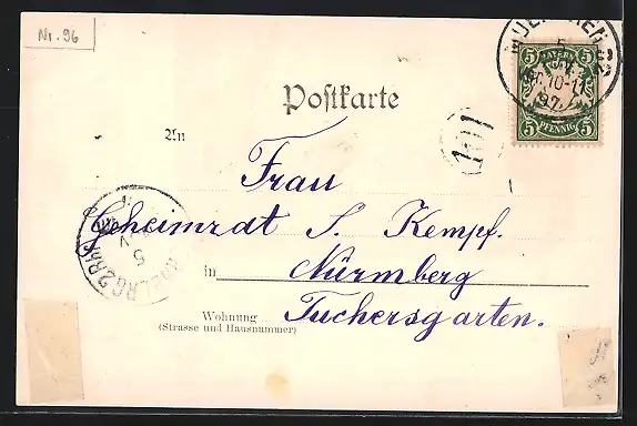 alte Ansichtskarte, gelaufen 1897, Geklebter Einriss li. unten, Eckknick re. unten