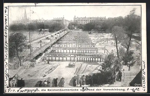 AK München, Die Reichenbachbrücke während der Verschiebungsarbeiten
