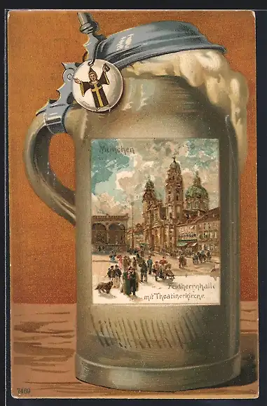 AK München, Feldherrnhalle mit Theatinerkirche auf Bierkrug