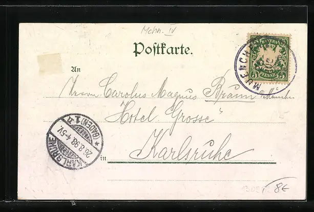 gelaufen 1898, rückseitig Klebe- und Papierreste, guter Zustand