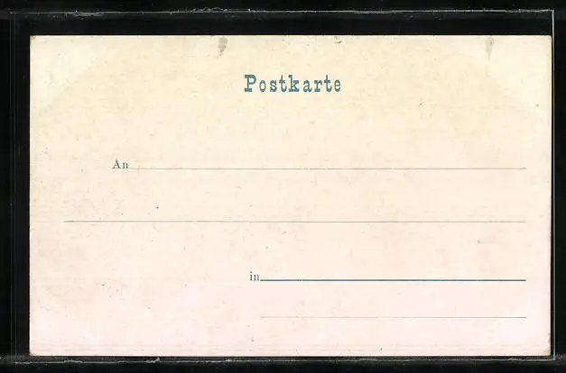 Personenbezogene Daten auf der Rückseite der Karte wurden durch blauen Textmarker unkenntlich gemacht. Die blauen Stellen sind auf die Vorderseite durchgeweicht und wirken sich negativ auf das Postkartenfoto aus