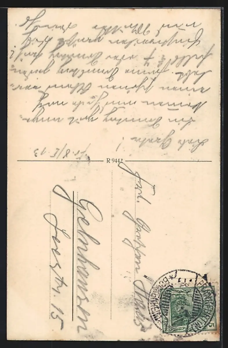 Personenbezogene Daten auf der Rückseite der Karte wurden durch blauen Textmarker unkenntlich gemacht. Die blauen Stellen sind auf die Vorderseite durchgeweicht und wirken sich negativ auf das Postkartenfoto aus
