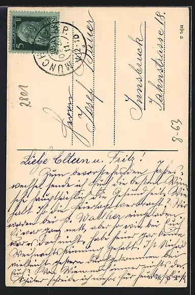 Personenbezogene Daten auf der Rückseite der Karte wurden durch blauen Textmarker unkenntlich gemacht. Die blauen Stellen sind auf die Vorderseite durchgeweicht und wirken sich negativ auf das Postkartenfoto aus