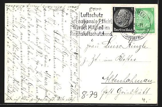 Personenbezogene Daten auf der Rückseite der Karte wurden durch blauen Textmarker unkenntlich gemacht. Die blauen Stellen sind auf die Vorderseite durchgeweicht und wirken sich negativ auf das Postkartenfoto aus