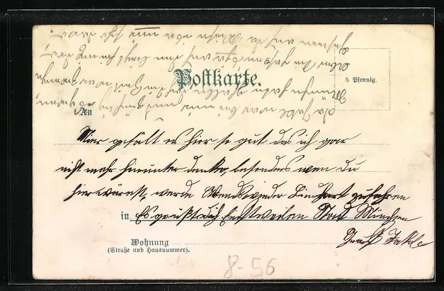Personenbezogene Daten auf der Rückseite der Karte wurden durch blauen Textmarker unkenntlich gemacht. Die blauen Stellen sind auf die Vorderseite durchgeweicht und wirken sich negativ auf das Postkartenfoto aus