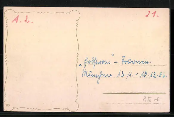 Personenbezogene Daten auf der Rückseite der Karte wurden durch blauen Textmarker unkenntlich gemacht. Die blauen Stellen sind auf die Vorderseite durchgeweicht und wirken sich negativ auf das Postkartenfoto aus
