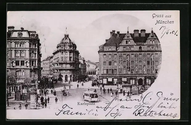 AK München, Karlsplatz mit Geschäft und Strassenbahn