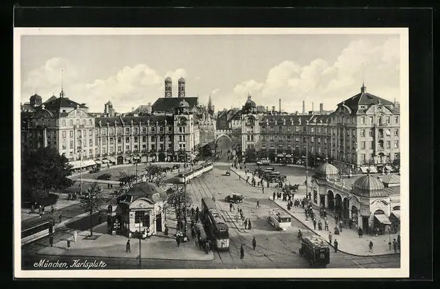 AK München, Karlsplatz mit Geschäften und Strassenbahn
