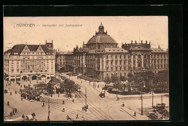 AK München, Karlsplatz mit Justizpalast, Strassenbahn