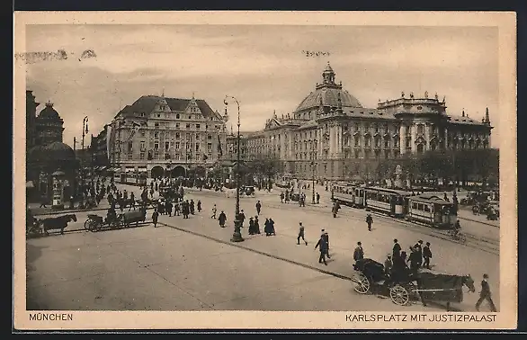 AK München, Karlsplatz mit Justizpalast, Strassenbahn