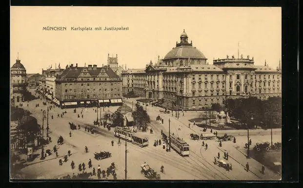 AK München, Karlsplatz mit Justizpalast und Strassenbahnen