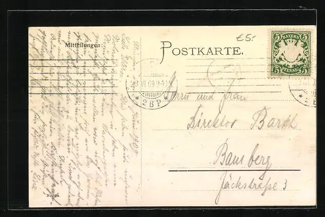Personenbezogene Daten auf der Rückseite der Karte wurden durch blauen Textmarker unkenntlich gemacht. Die blauen Stellen sind auf die Vorderseite durchgeweicht und wirken sich negativ auf das Postkartenfoto aus