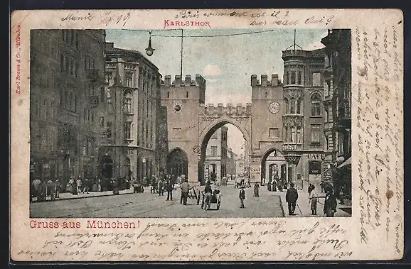 AK München, Karlstor mit Passanten und Cafe