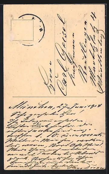 gelaufen 1914, Briefmarke entfernt, Eckknicke unten, guter Zustand