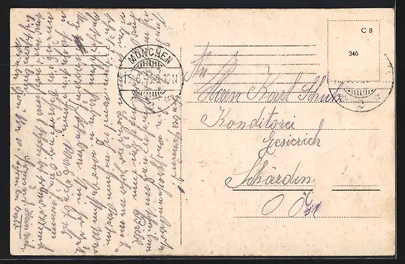 alte Ansichtskarte, gelaufen 1911, Briefmarke entfernt, rückseitig Oberflächenschaden, Abriebspur re. oben, guter Zustand