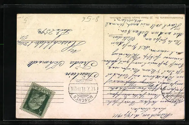 Personenbezogene Daten auf der Rückseite der Karte wurden durch blauen Textmarker unkenntlich gemacht. Die blauen Stellen sind auf die Vorderseite durchgeweicht und wirken sich negativ auf das Postkartenfoto aus