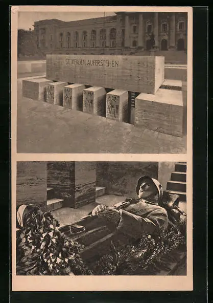 AK München, Kriegerdenkmal, Aussen- und Innenansicht, vor dem Armeemuseum