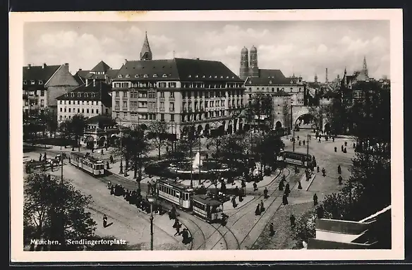 AK München, Leute an der Strassenbahnhaltstelle auf dem Sendlingertorplatz