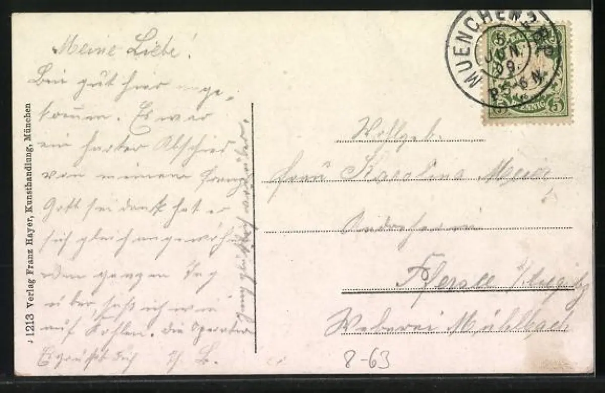 Personenbezogene Daten auf der Rückseite der Karte wurden durch blauen Textmarker unkenntlich gemacht. Die blauen Stellen sind auf die Vorderseite durchgeweicht und wirken sich negativ auf das Postkartenfoto aus