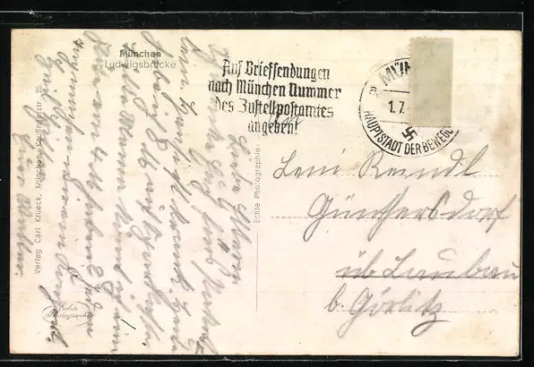 gelaufen 1941, Briefmarke tw. entfernt, guter Zustand