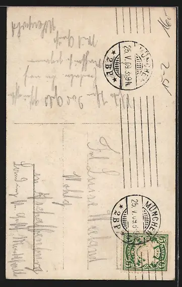 Personenbezogene Daten auf der Rückseite der Karte wurden durch blauen Textmarker unkenntlich gemacht. Die blauen Stellen sind auf die Vorderseite durchgeweicht und wirken sich negativ auf das Postkartenfoto aus