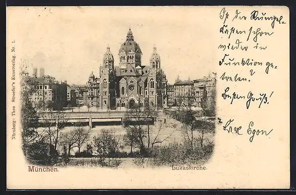 AK München, Lukaskirche mit Brücke