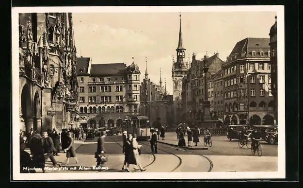 AK München, Marienplatz mit Altem Rathaus und Strassenbahn