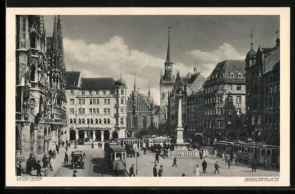 AK München, Marienplatz mit Gedenksäule, Strassenbahnen und Autos