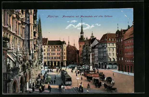 AK München, Marienplatz mit Mariensäule und altes Rathaus, Strassenbahn