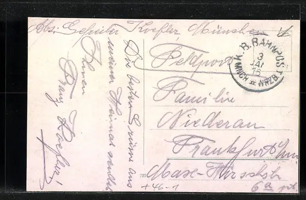 Personenbezogene Daten auf der Rückseite der Karte wurden durch blauen Textmarker unkenntlich gemacht. Die blauen Stellen sind auf die Vorderseite durchgeweicht und wirken sich negativ auf das Postkartenfoto aus