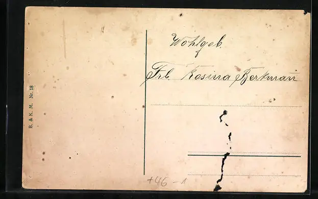 Personenbezogene Daten auf der Rückseite der Karte wurden durch blauen Textmarker unkenntlich gemacht. Die blauen Stellen sind auf die Vorderseite durchgeweicht und wirken sich negativ auf das Postkartenfoto aus