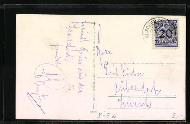 Personenbezogene Daten auf der Rückseite der Karte wurden durch blauen Textmarker unkenntlich gemacht. Die blauen Stellen sind auf die Vorderseite durchgeweicht und wirken sich negativ auf das Postkartenfoto aus