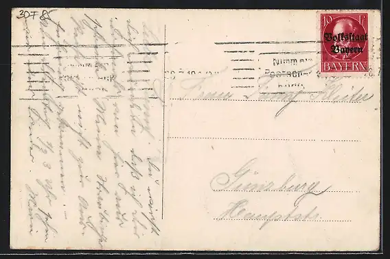 Personenbezogene Daten auf der Rückseite der Karte wurden durch blauen Textmarker unkenntlich gemacht. Die blauen Stellen sind auf die Vorderseite durchgeweicht und wirken sich negativ auf das Postkartenfoto aus