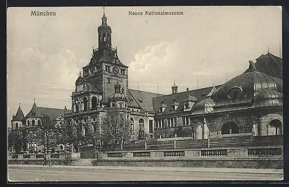 AK München, Neues Nationalmuseum mit Strassenpartie